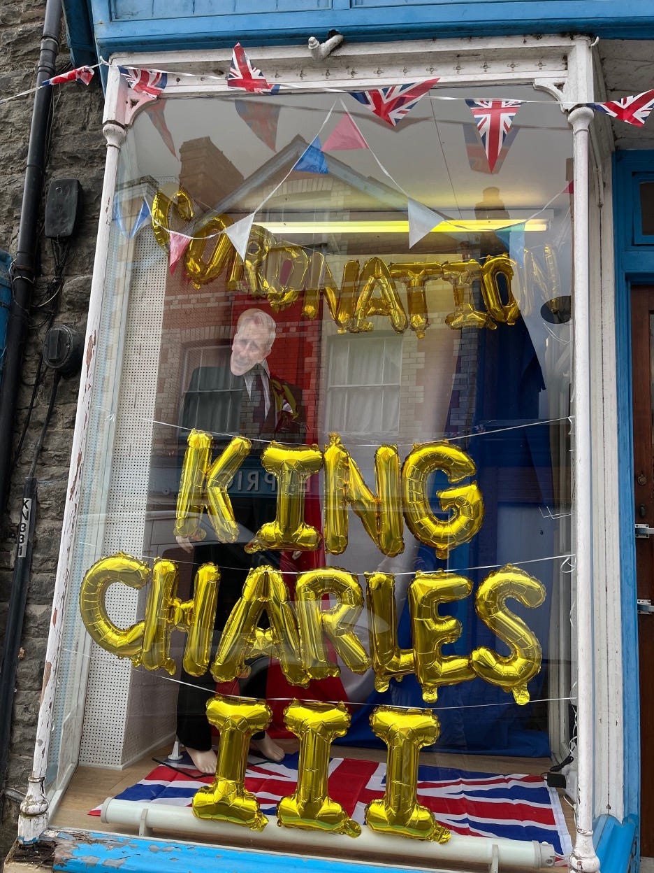 We started walking at a surprisingly early at 9:15. We’d packed all the bags and backpacks for the plane, so I thought we’d have to spend more time swapping and moving things around. Maybe we have just figured out how to travel? Walking though Knighton we saw of businesses decorated for tomorrow’s celebration of King Charles III coronation. It was both neat and a little weird, as an American, to see a celebration of the lucky sperm club.