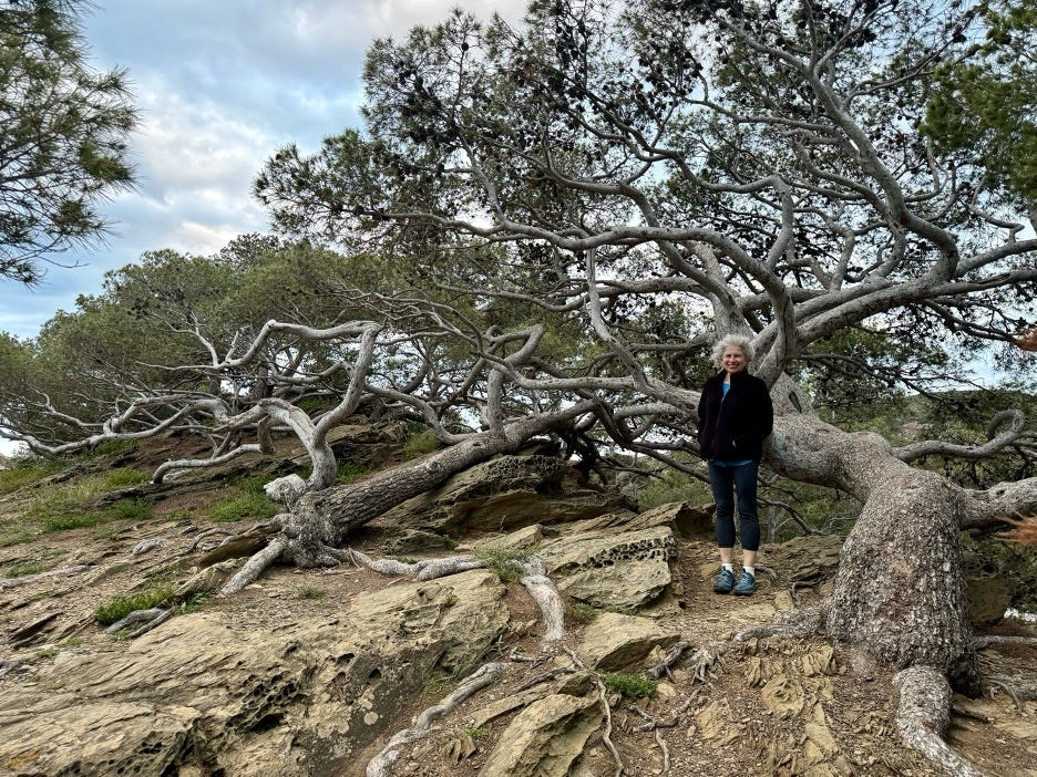 Pam standing among the cade/cadaqué. She’s facing into the Tramontane wind so notice how everything grows.
