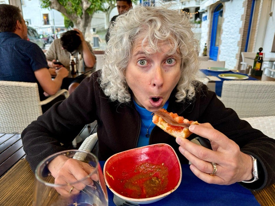 Of course, Spain is all about eating! Being a fishing village, you know that the fish is to die for. Since we had eaten our way across the Atlantic, we weren’t full dinner hungry so just hit up a couple of places for tapas. We had a wonderful meatball in brown sauce with shrimp. I know that sounds off to most Americans, but it was excellent. We (mainly me) had to have the Cadaqués specialty of anchovies at multiple places. The tradition is to take that wonderful, fresh, daily baked, Spanish bread, spread a smear of tomatoes on them, and lay a single anchovy on the top. These are fresh anchovy simply smothered in olive oil so lack the over saltiness of American anchovies. They were so, so good that my goal is to eat 20 pounds tomorrow. Even Pam liked them!